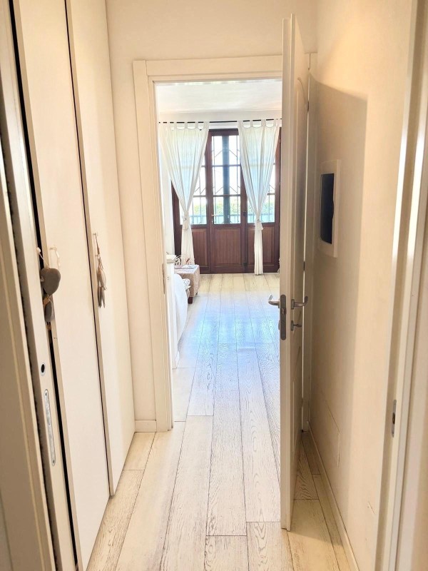 L'immobile in ottima posizione esclusiva, vicino a tutti i servizi offre anche una vista mare. Situato in una zona esclusiva, questo fabbricato con un accesso diretto a un ampio giardino di (circa 330 mq.) da cui si può anche intravedere il mare e di facile accesso alla spiaggia. L'appartamento al piano terra (interamente pavimentato con listoni di parquet in rovere verniciati con colorazione chiara) dispone di un luminoso soggiorno con ampie terrazze esterne dove potere pranzare, soggiorno openspace, disimpegno, camera da letto matrimoniale (dal quale si accede ad una seconda luminosa terrazza esterna), camera singola (stanza armadi), due bagni. Al piano seminterrato, si distribuisce un ampio vano multiuso di oltre 60 m², stanza ripostiglio, camera da letto ed un bagno. Costruito nel 2005 con finiture di alta qualità tra cui il pregiato marmo bianco di Carrara (rivestimenti esterni delle scale e pietre angolari sulla facciata) ed infissi a taglio termico, questo immobile rappresenta una vera occasione per chi cerca comfort, eleganza e una posizione privilegiata fronte mare. Sul retro del fabbricato, la proprietà di dispone inoltre di due ampi parcheggi privati all'interno della resede della palazzina, accessibili per mezzo di cancello carrabile automatico.